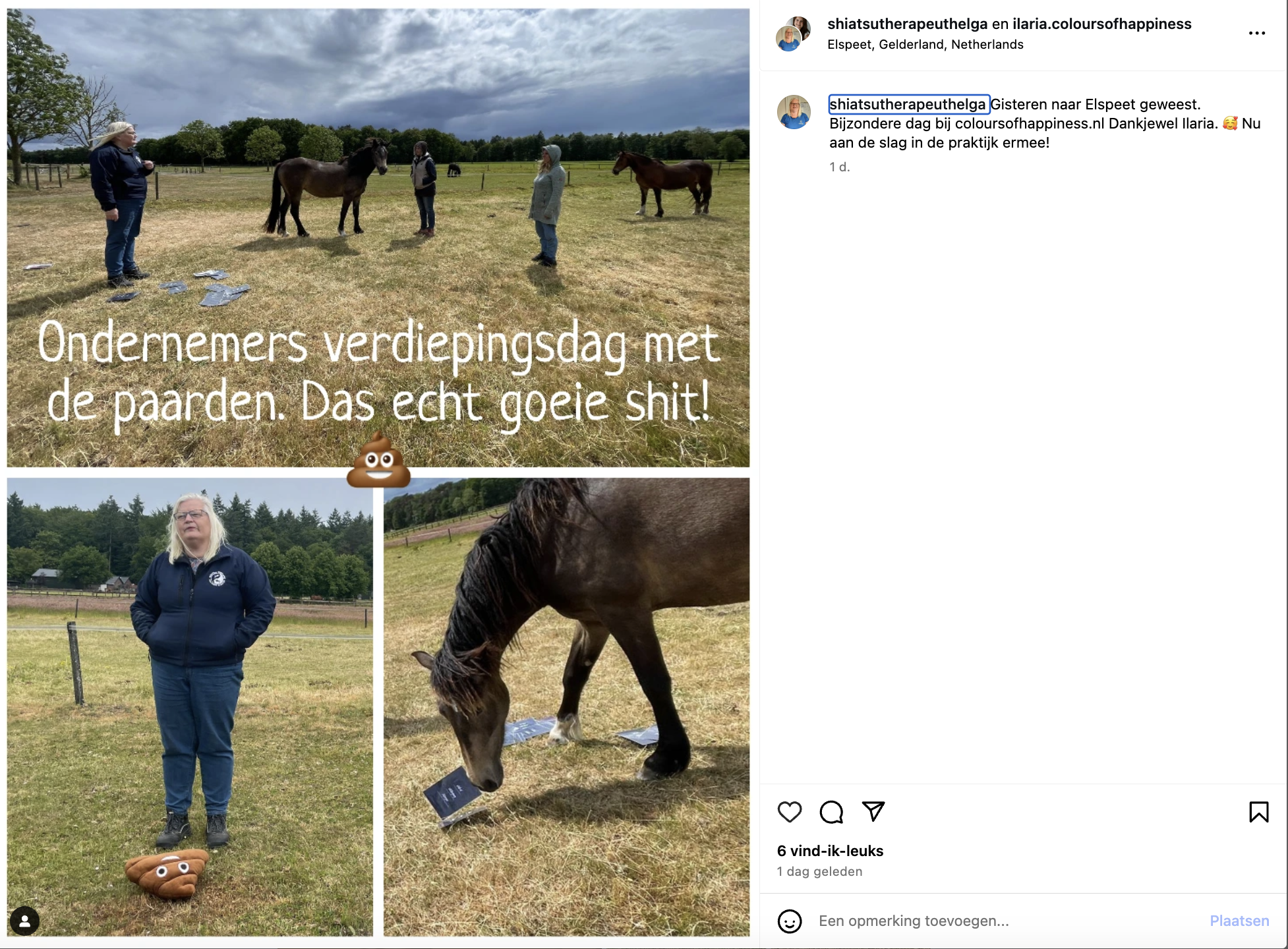Dat moment was voor mij zo belangrijk. Ik zag ineens al mijn eigen patronen heel helder. Hoe ik het bij de paarden deed, dat was hoe ik het overal deed – ook in mijn bedrijf. Dit zie ik ook bij alle coaches en therapeuten terug waar ik mee werk – in het ondernemerschap neem je al je oude shit van vroeger mee.